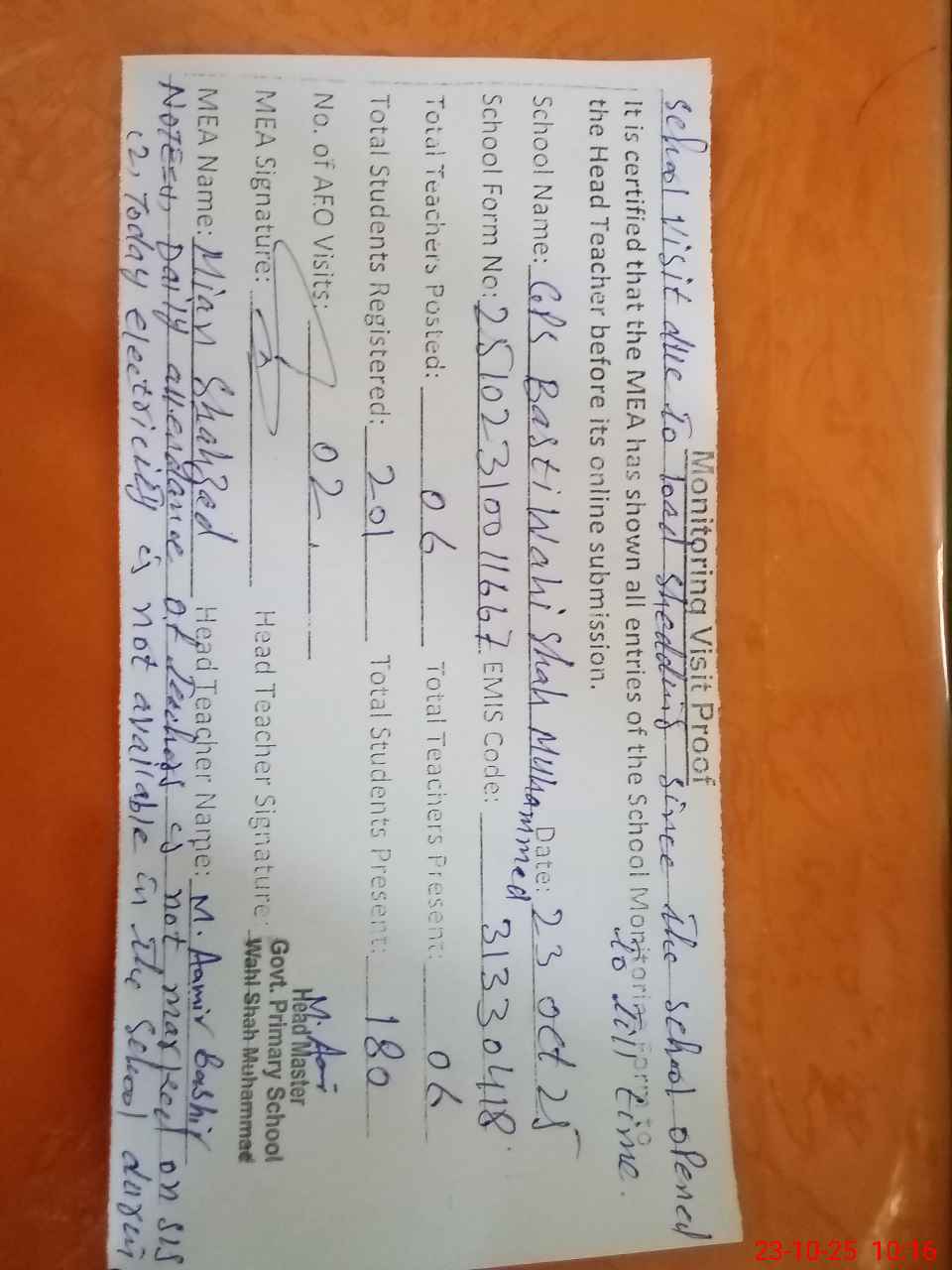 | Attendance Register | Head Teacher | MEA with School | Visit Proof |