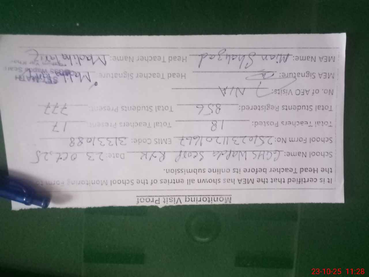 | Attendance Register | Head Teacher | MEA with School | Visit Proof |