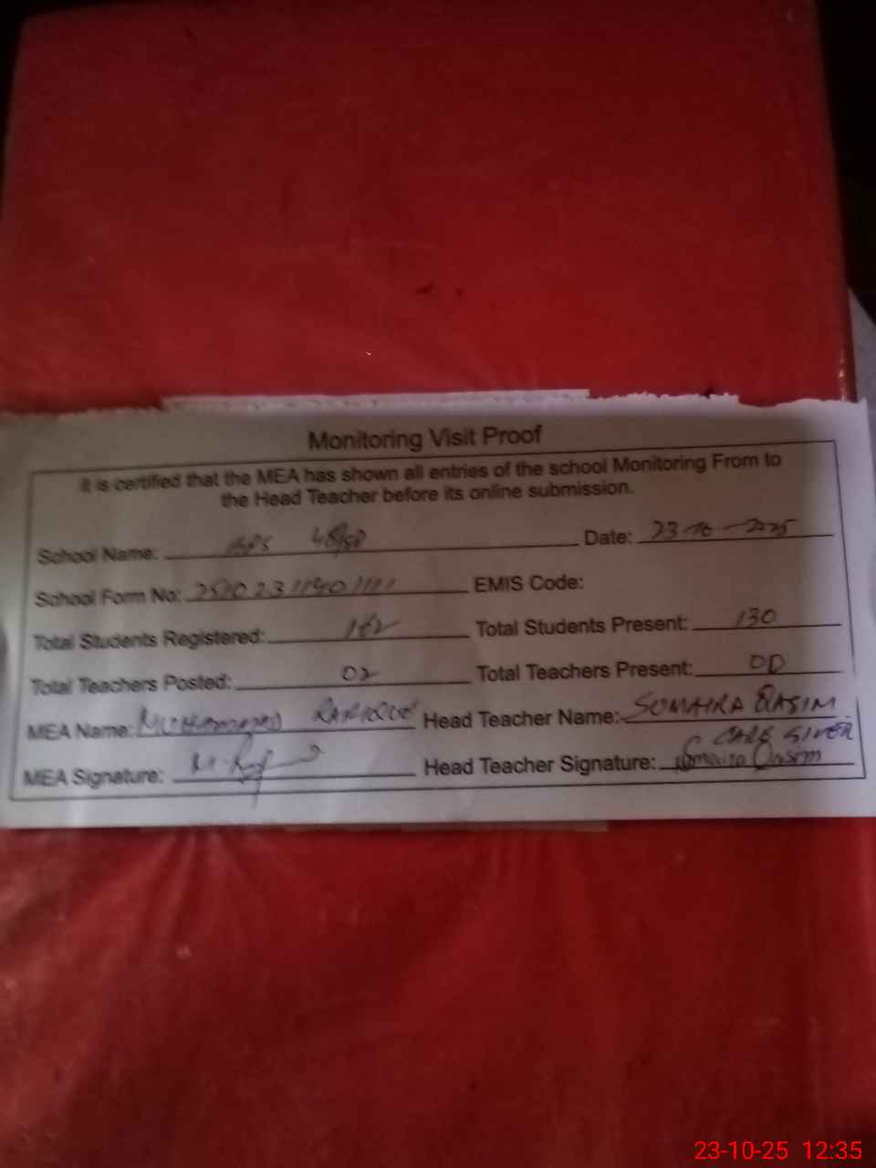 | Attendance Register | Head Teacher | MEA with School | Visit Proof |