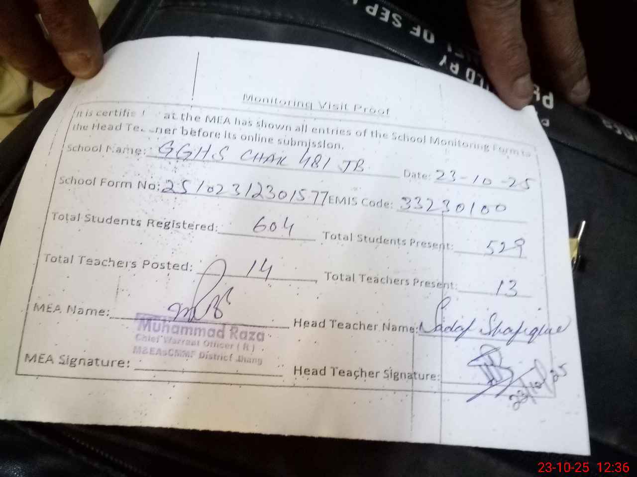 | EMIS Code: 33230100 | Name of School: GGHS CHAK NO 481 JB | |||
