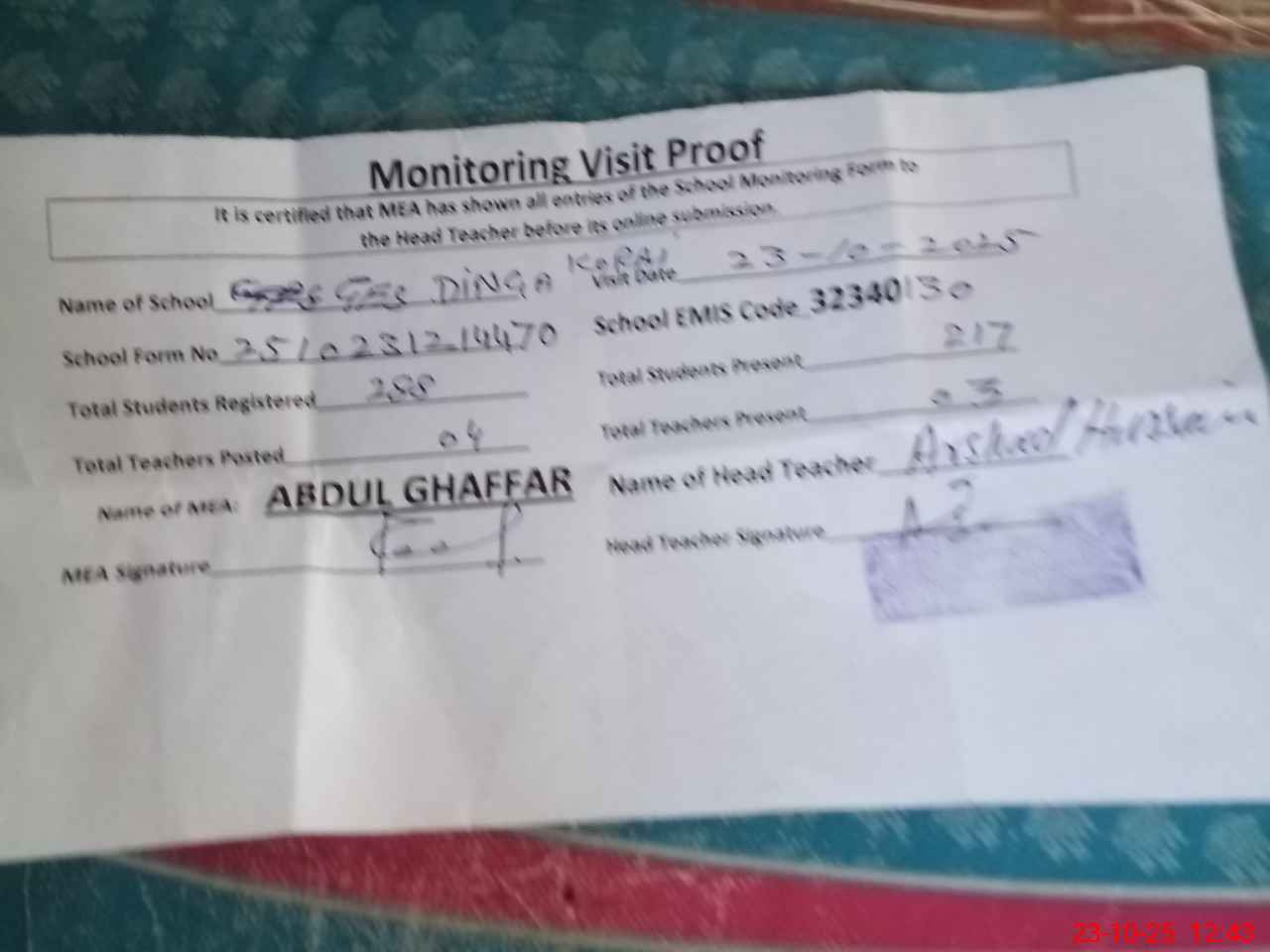 | Attendance Register | Head Teacher | MEA with School | Visit Proof |
