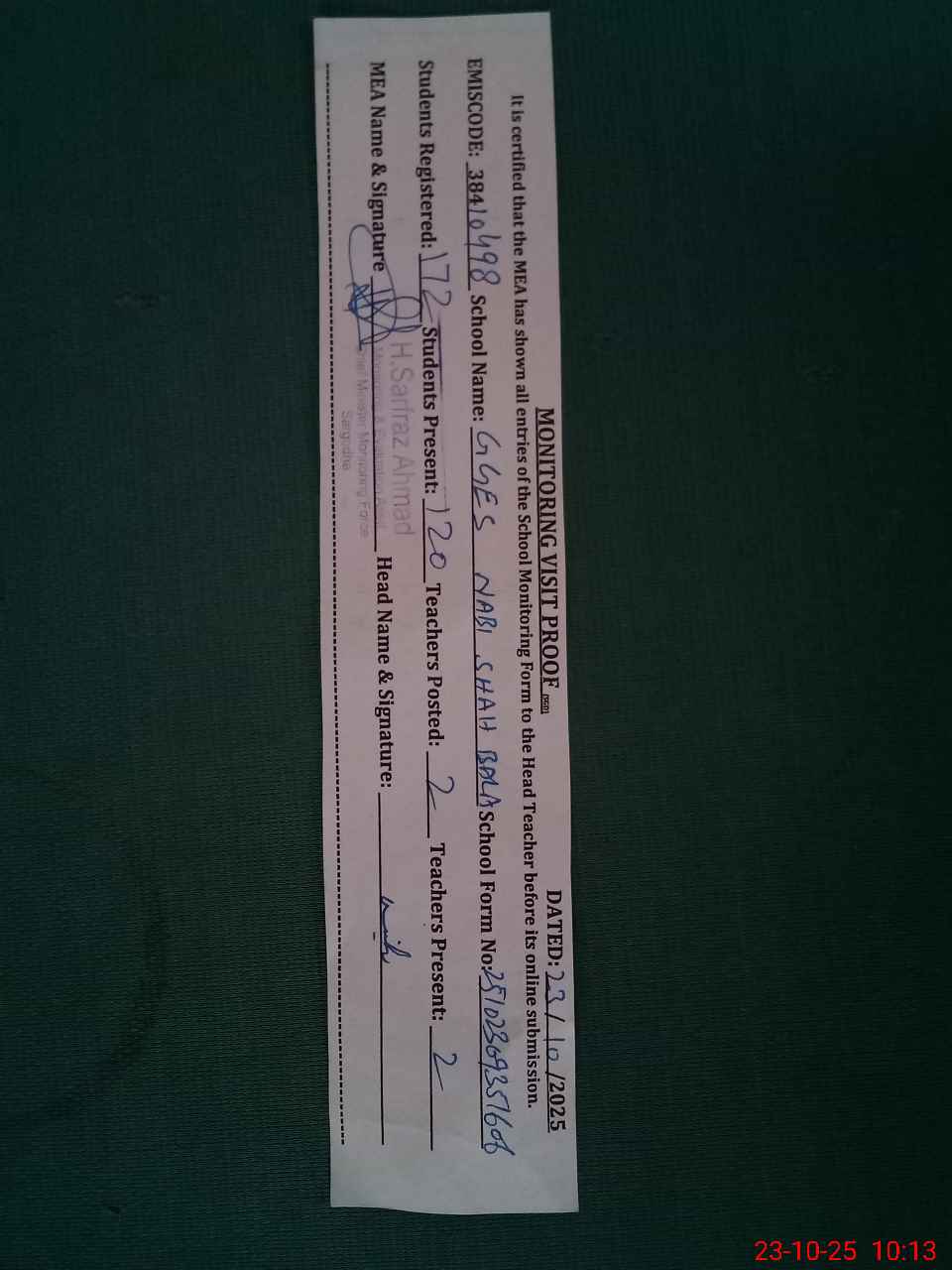 | Monitoring Date: 23-10-2025 | Start Time: 23-10-2025 09:35 AM | End Time: 23-10-2025 10:13 AM | Name of MEA: HA**** SA**** AH**** | |