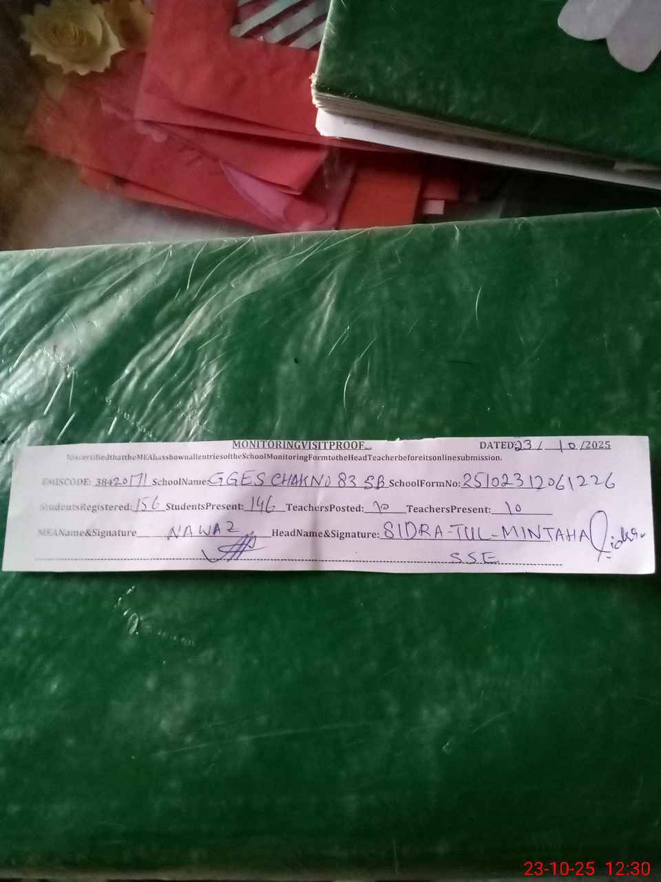 | Attendance Register | Head Teacher | MEA with School | Visit Proof |