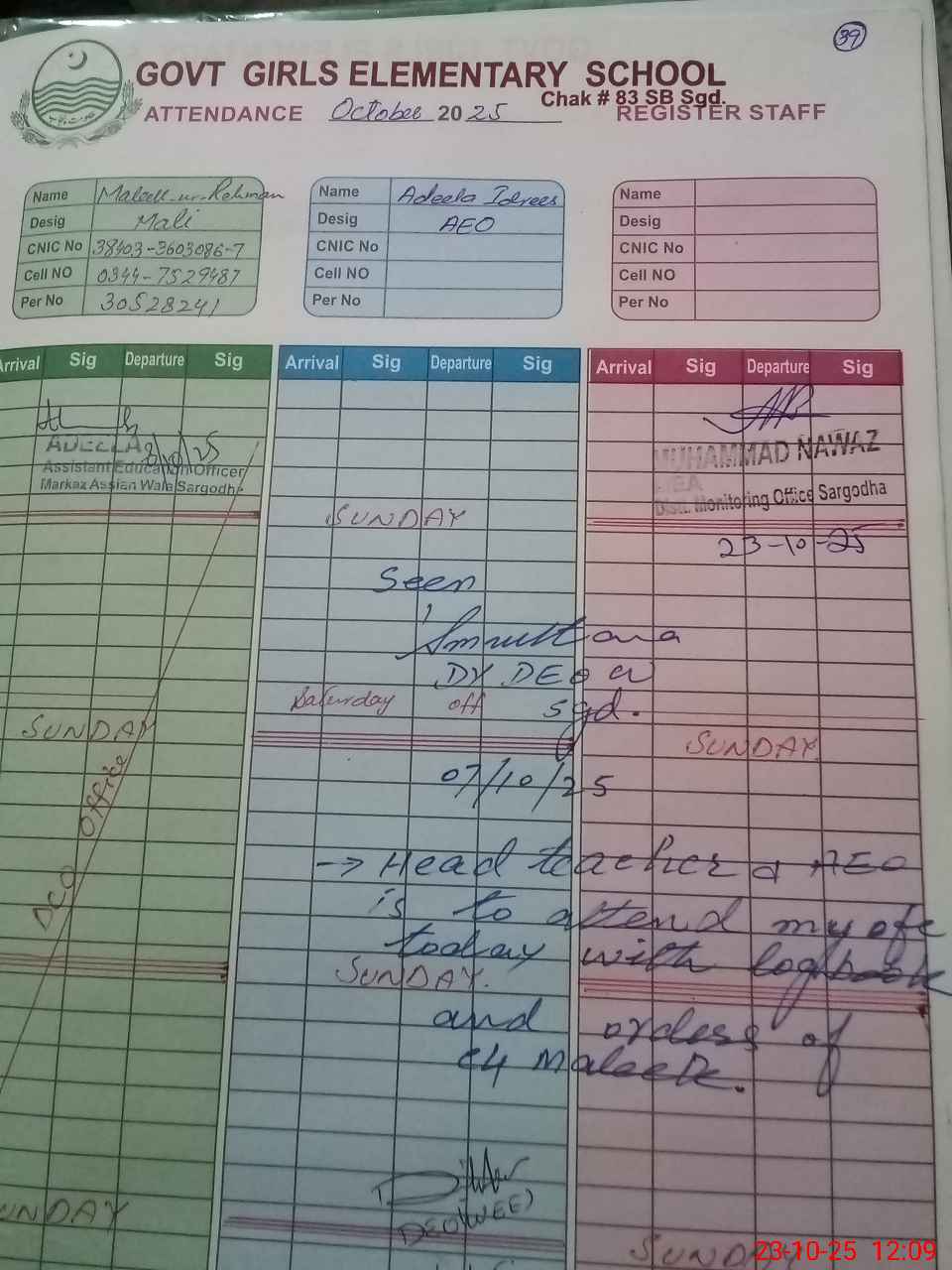 | CNIC | Full Name | Designation | R/C | Absence during last cal. month |