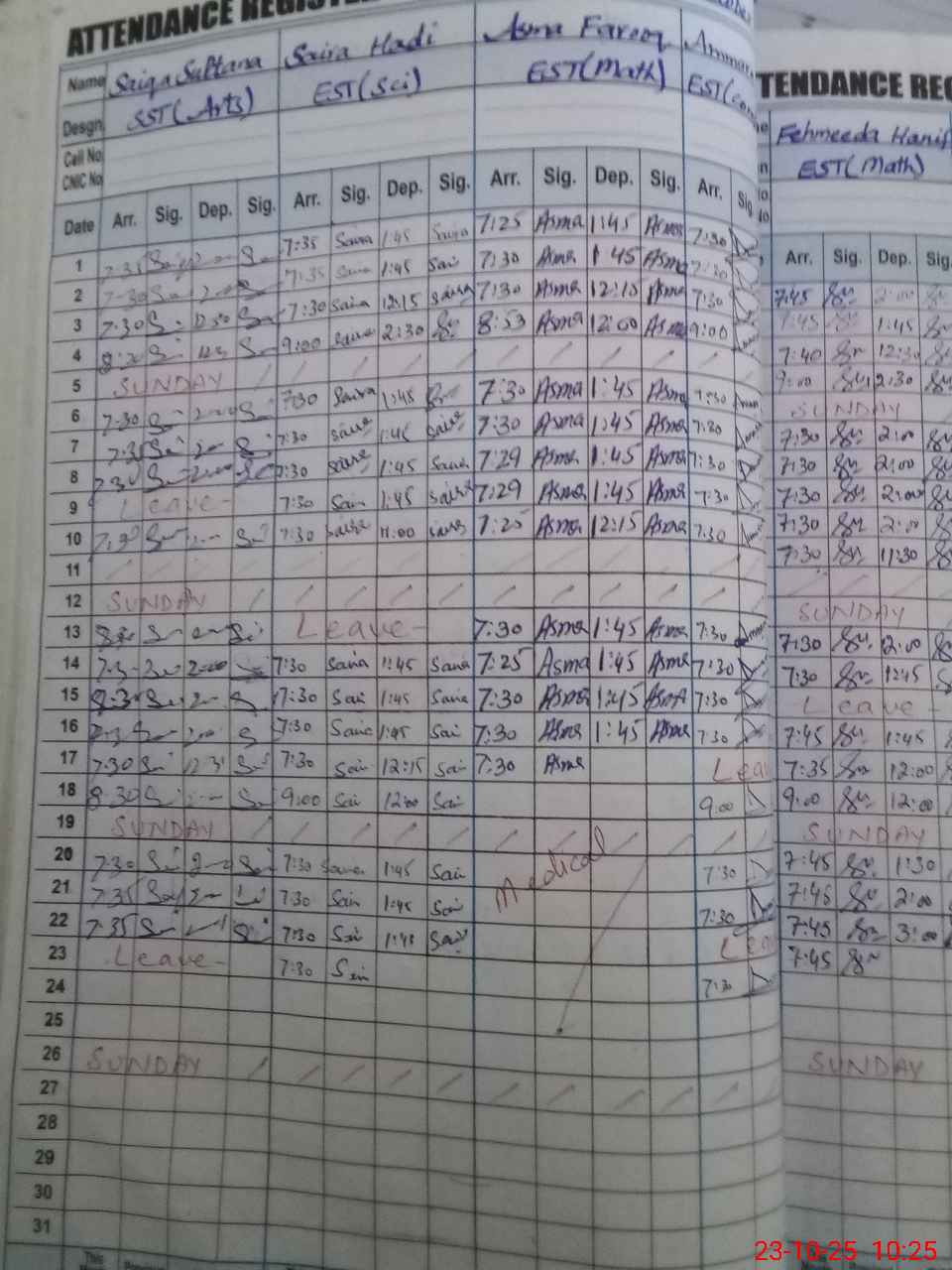 | Remarks (Use Separate Page if Required): Rubina Khan PST applied leave wef 06 October 2025 to 18 October 2025 but waiting for approval by DEO presently she was on medical leave as per attendance register but leave not applied due earlier leave pending mark absent Asna Farooq EST as per attendance register on medical leave wef 17 October 2025 but leave not applied so Mark absent 35210830 | |||||