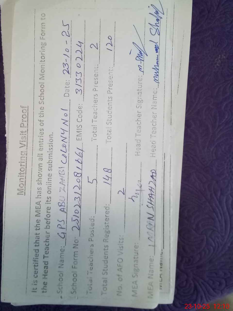 | Attendance Register | Head Teacher | MEA with School | Visit Proof |
