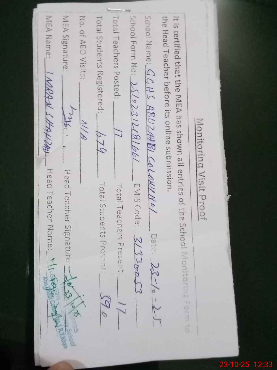 | Attendance Register | Head Teacher | MEA with School | Visit Proof |