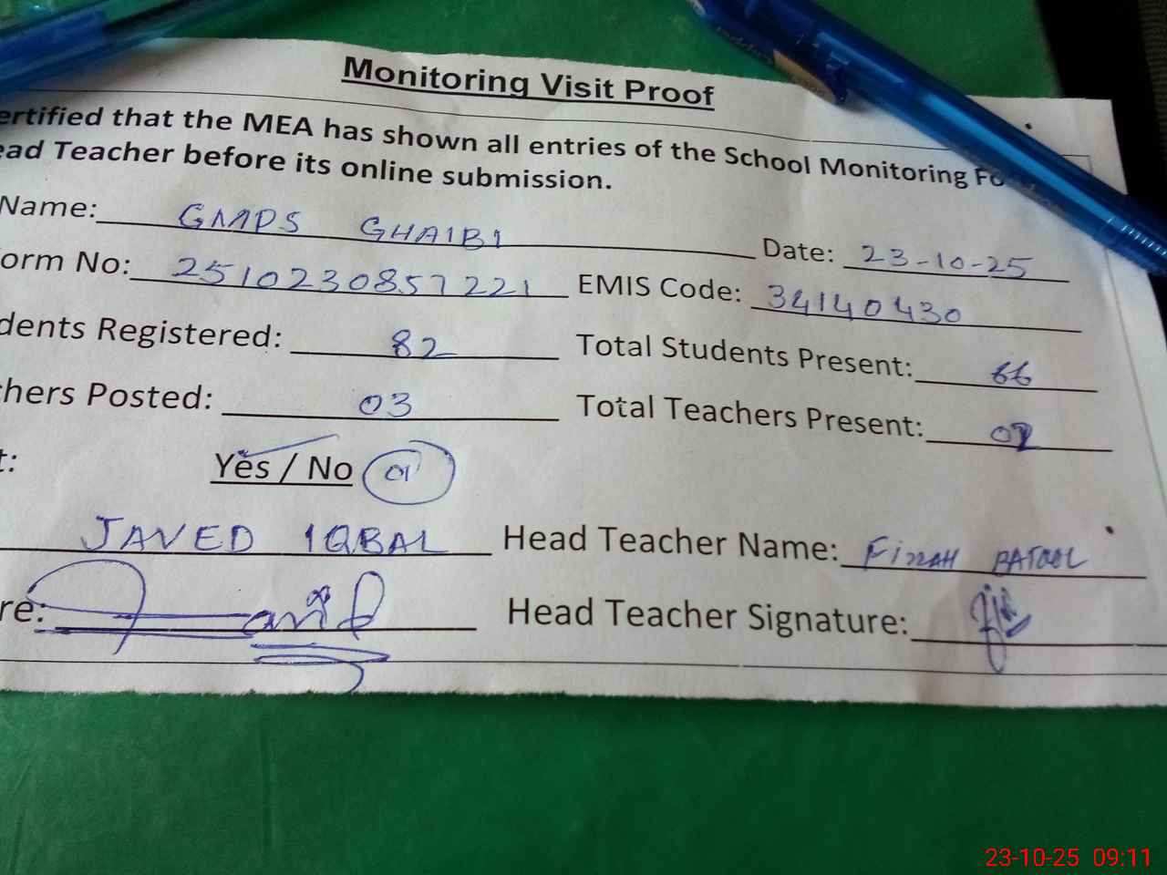 | Attendance Register | Head Teacher | MEA with School | Visit Proof |