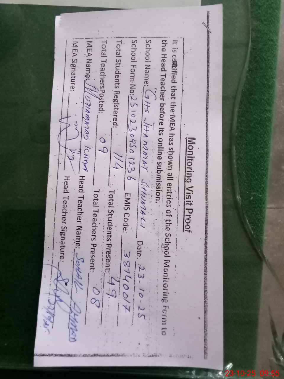 | Attendance Register | Head Teacher | MEA with School | Visit Proof |