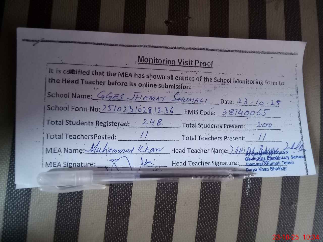 | Monitoring Date: 23-10-2025 | Start Time: 23-10-2025 10:00 AM | End Time: 23-10-2025 10:38 AM | Name of MEA: Mu**** Kh**** | |