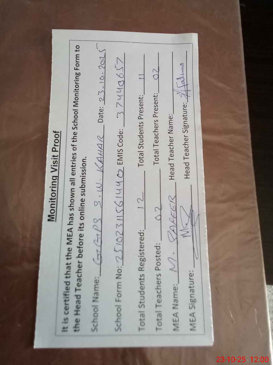 | Attendance Register | Head Teacher | MEA with School | Visit Proof |