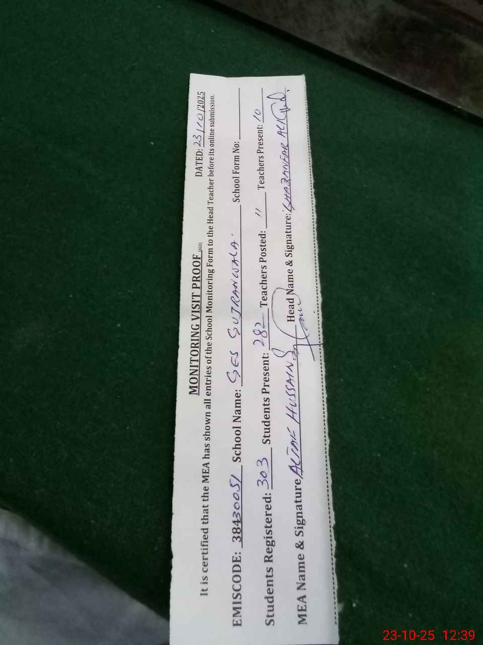| Monitoring Date: 23-10-2025 | Start Time: 23-10-2025 12:17 PM | End Time: 23-10-2025 12:39 PM | Name of MEA: AL**** HU**** | |
