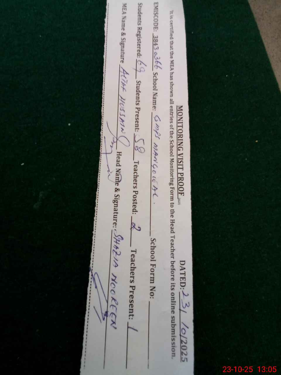 | Attendance Register | Head Teacher | MEA with School | Visit Proof |
