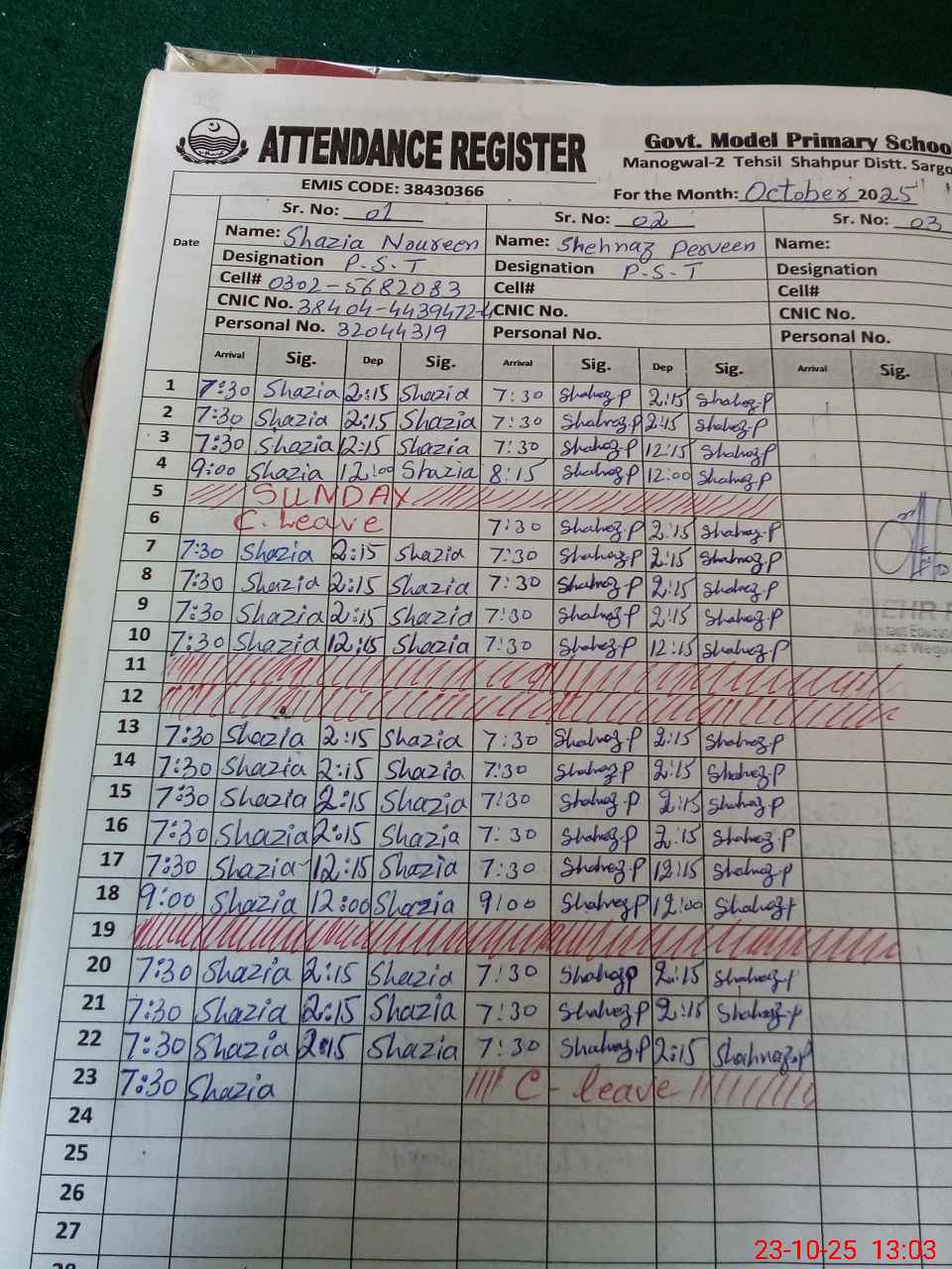 | CNIC | Full Name | Designation | R/C | Absence During Last Calender Month |