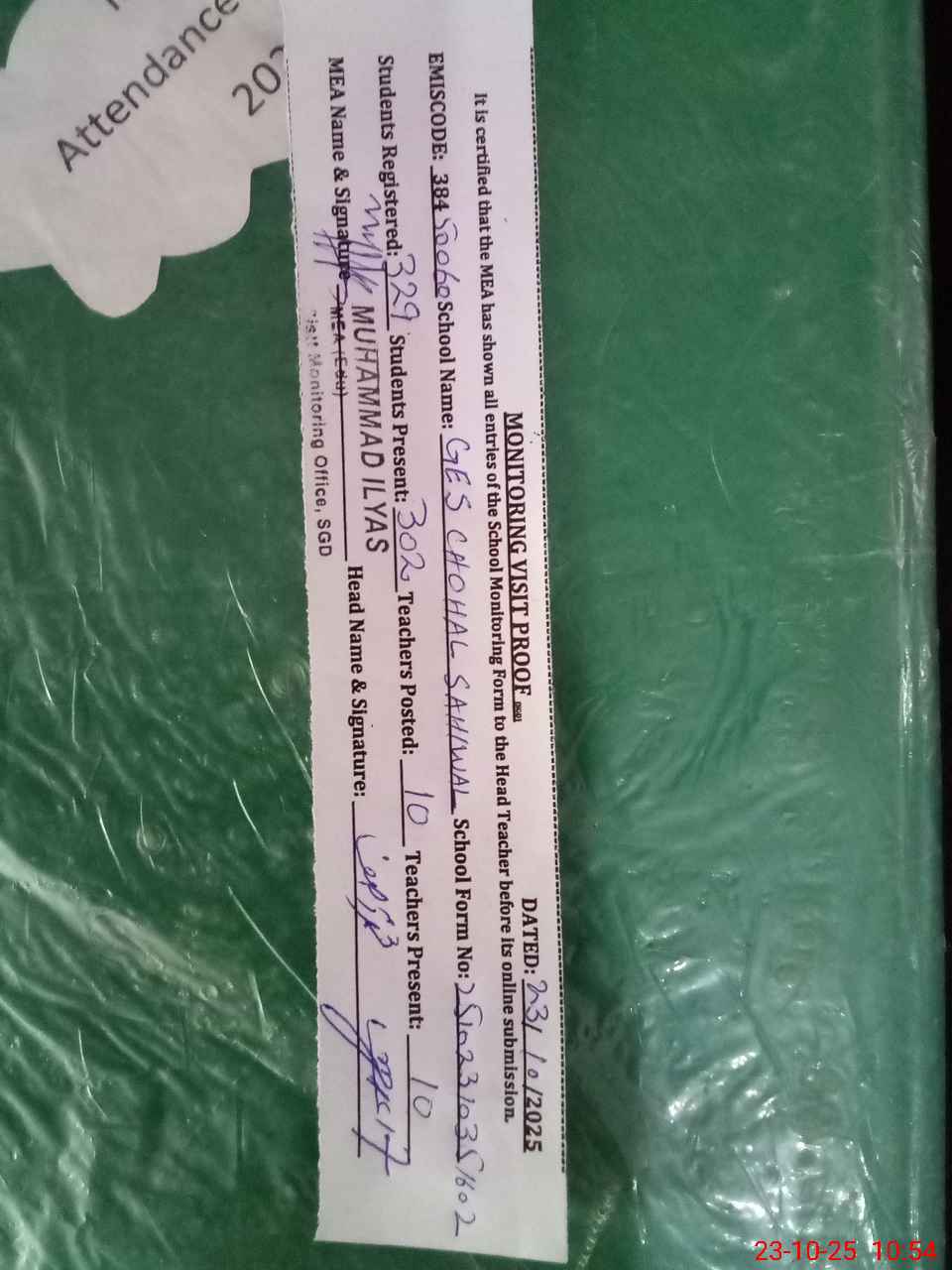 | Attendance Register | Head Teacher | MEA with School | Visit Proof |