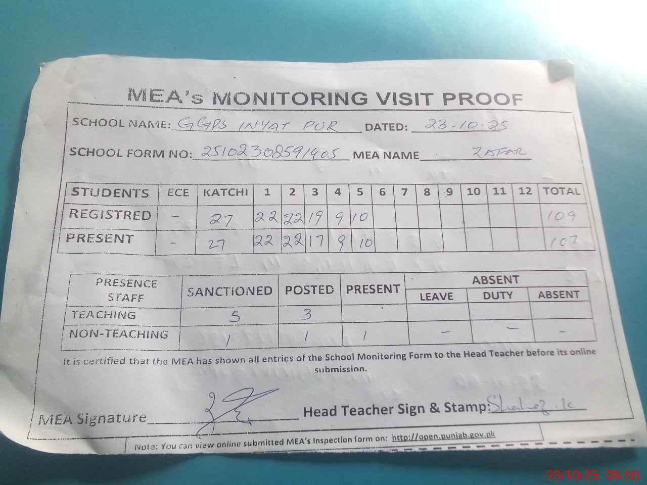 | EMIS Code: 36410344 | Name of School: GGPS INAYAT PUR NO.2 KABIRWALA | |||