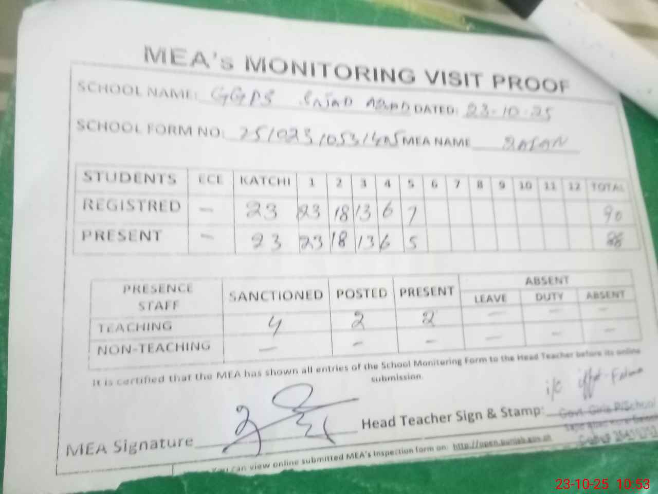 | Attendance Register | Head Teacher | MEA with School | Visit Proof |