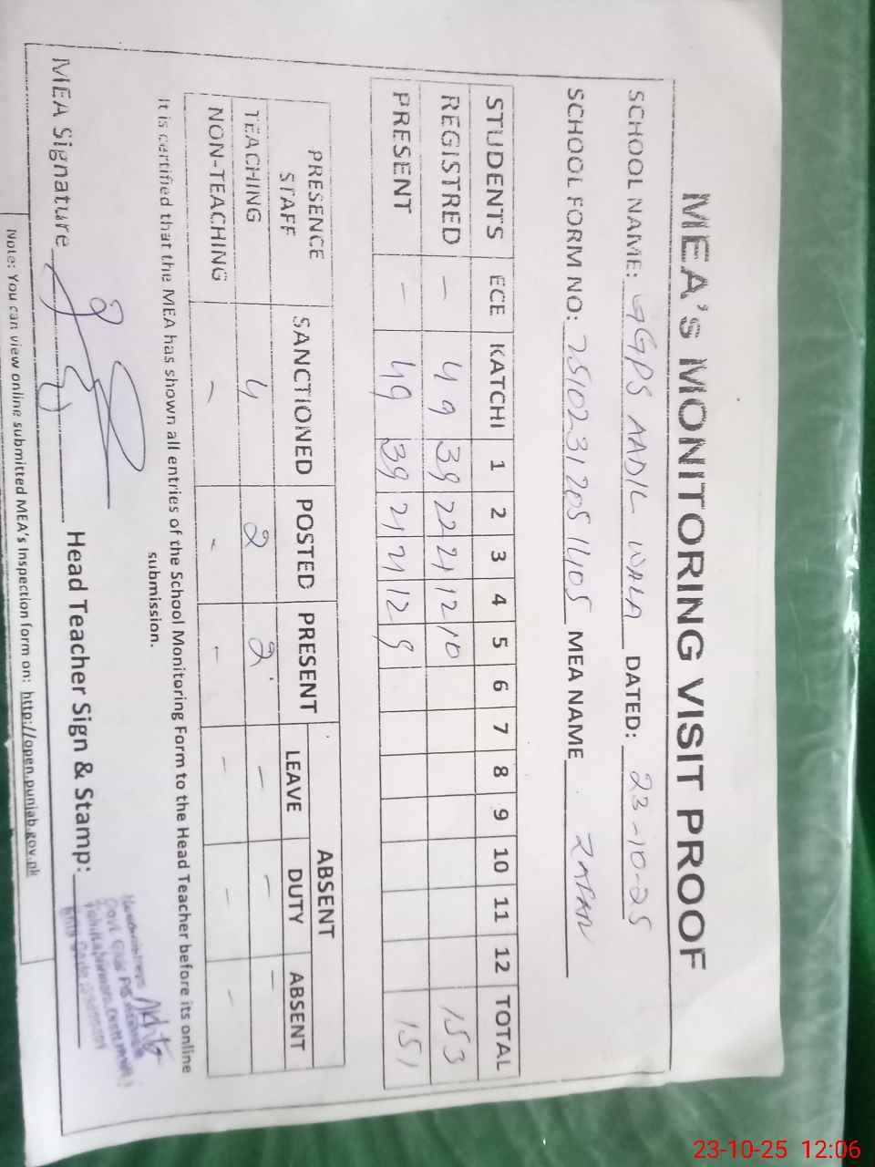 | Attendance Register | Head Teacher | MEA with School | Visit Proof |