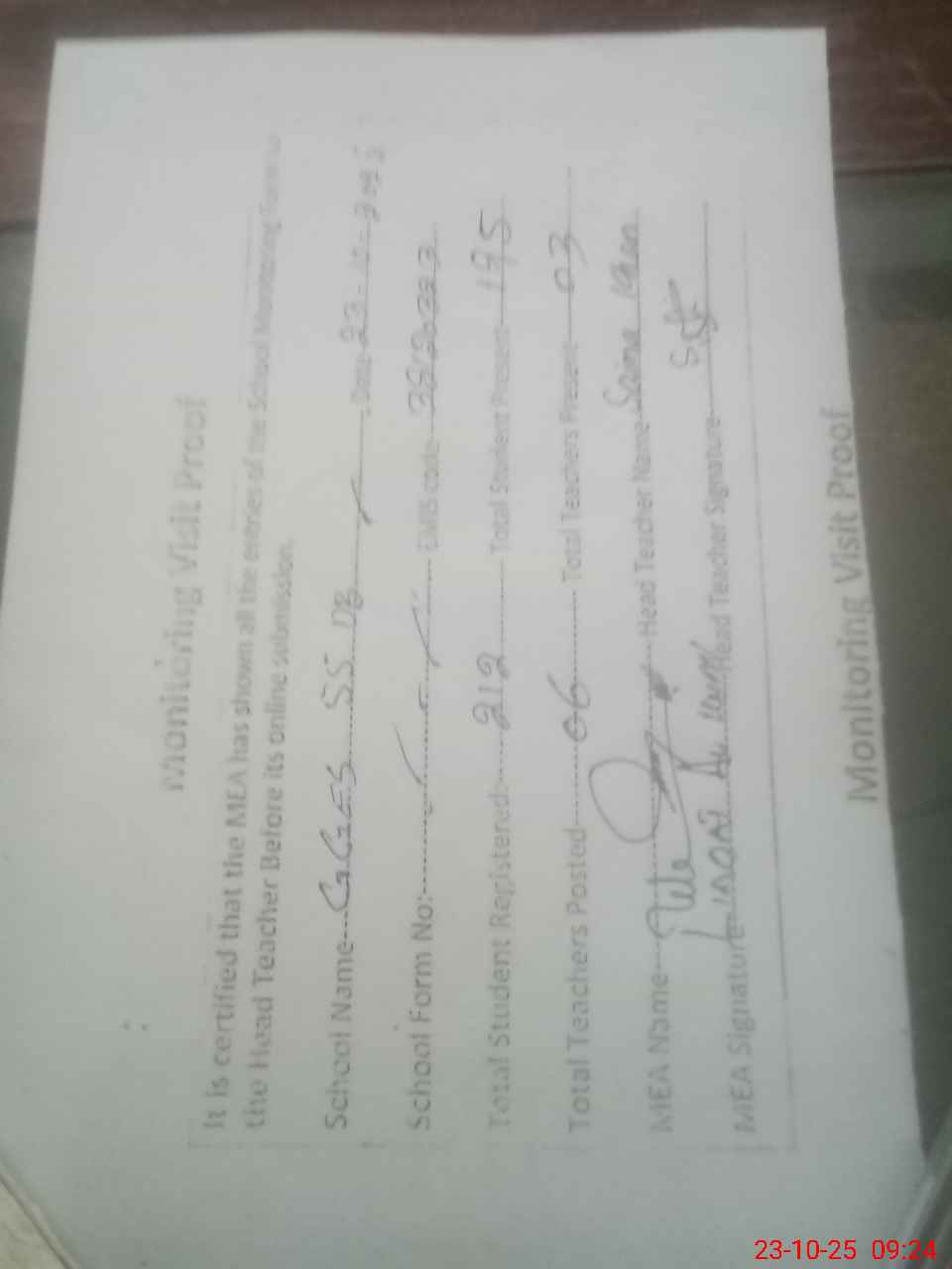 | Attendance Register | Head Teacher | MEA with School | Visit Proof |