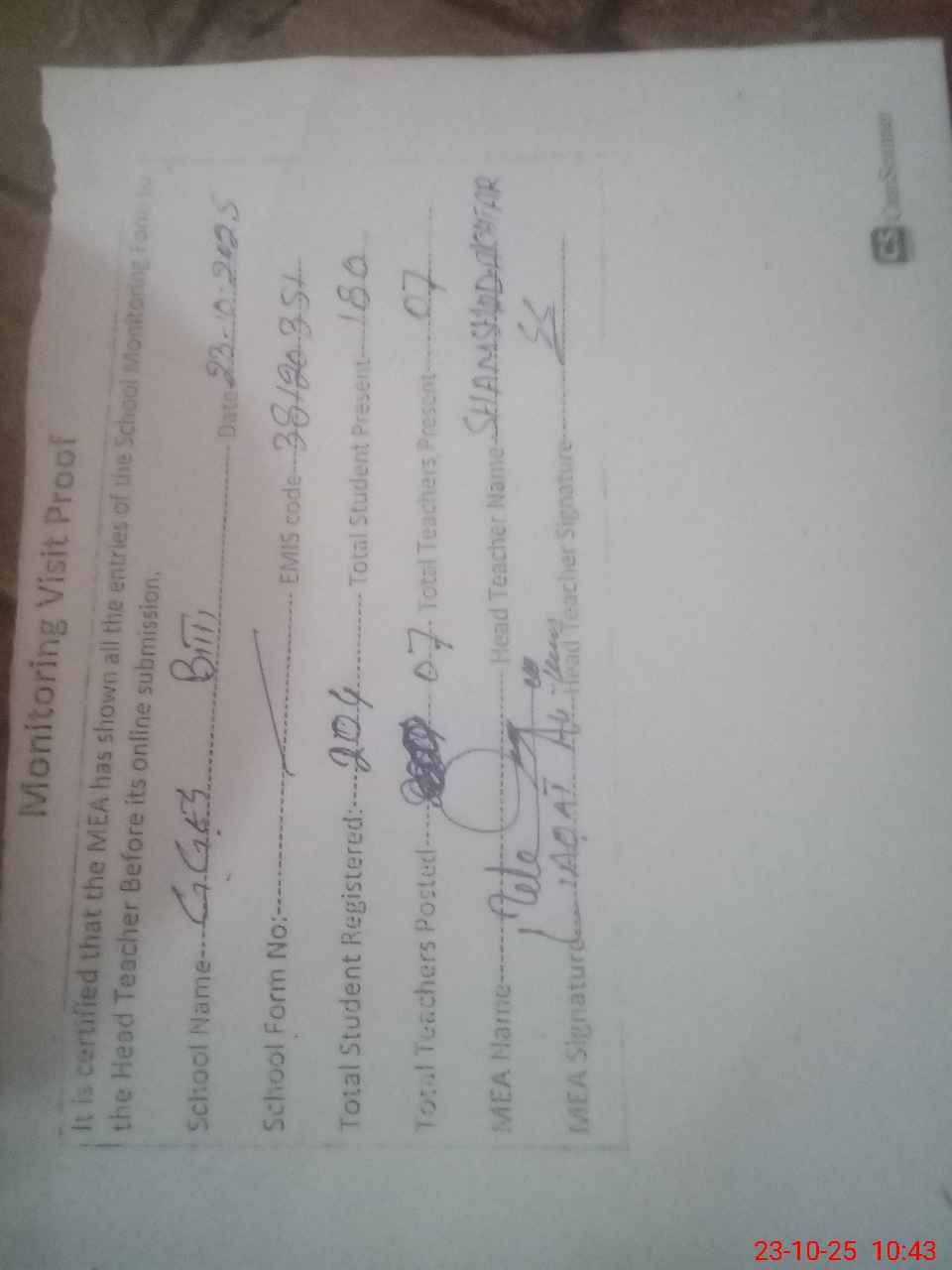 | Attendance Register | Head Teacher | MEA with School | Visit Proof |