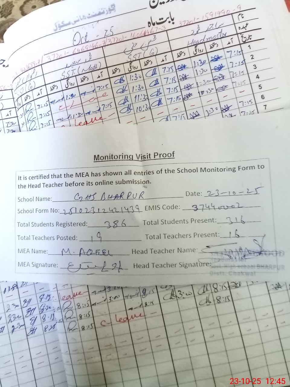 | Attendance Register | Head Teacher | MEA with School | Visit Proof |