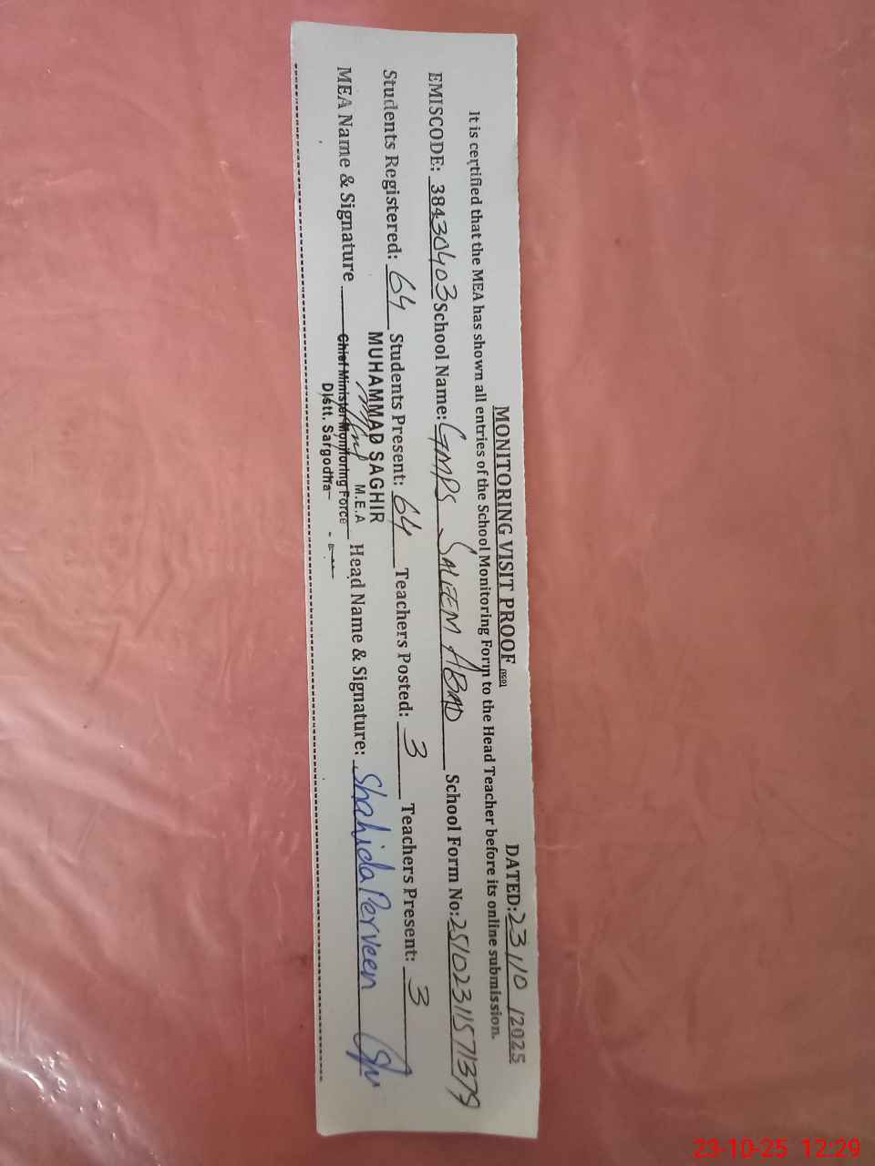| Certified that this School was Inspected by the Undersigned MEA/DMO Today and the Information Stated Above is as Per Record. | |||||