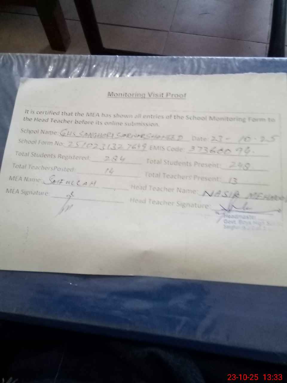 | Attendance Register | Head Teacher | MEA with School | Visit Proof |