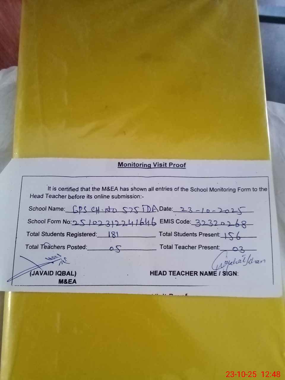 | Attendance Register | Head Teacher | MEA with School | Visit Proof |