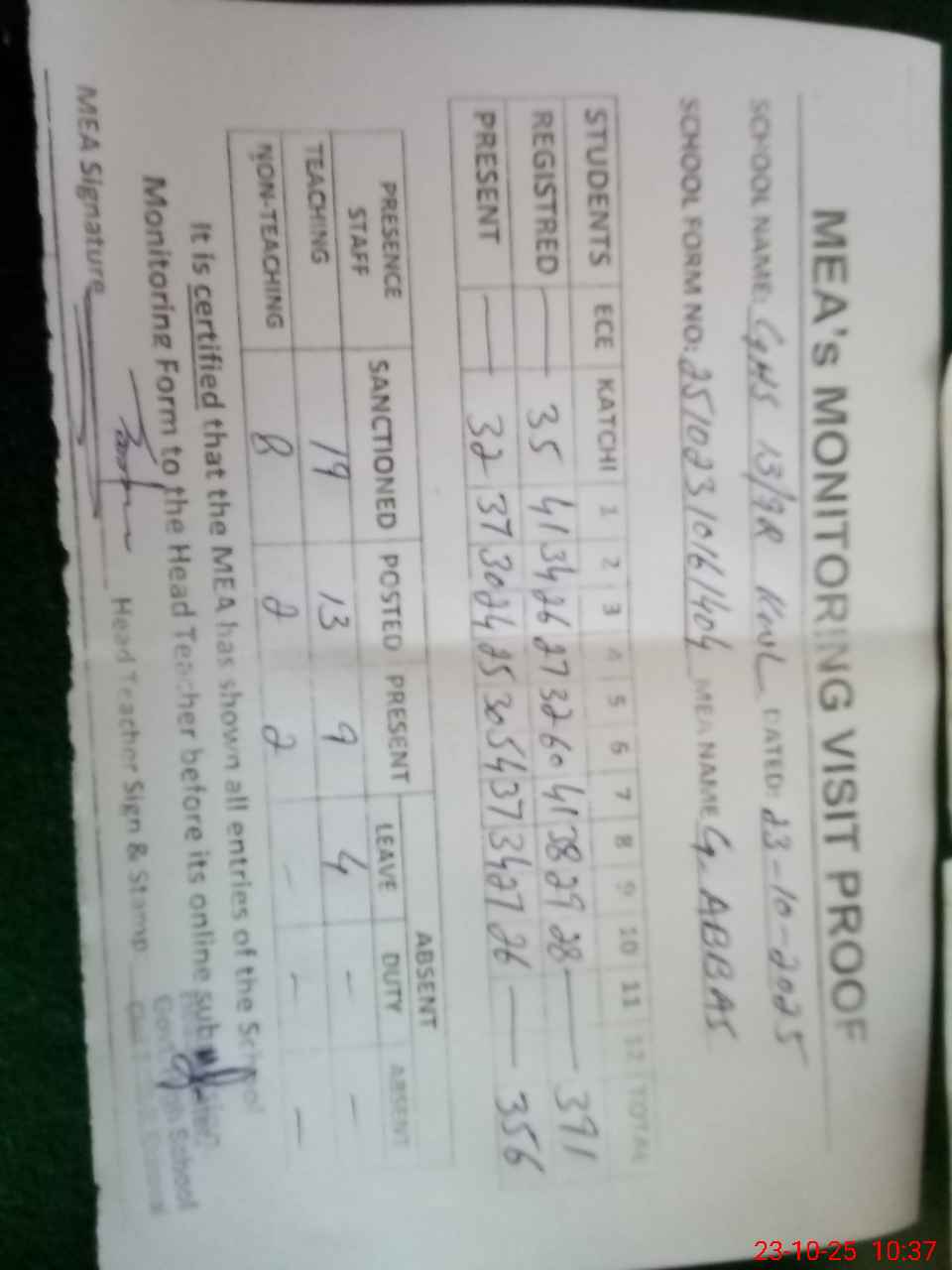 | Attendance Register | Head Teacher | MEA with School | Visit Proof |
