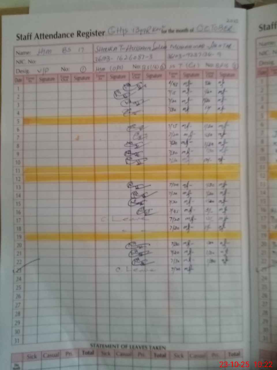 | CNIC | Full Name | Designation | R/C | Absence During Last Calender Month |