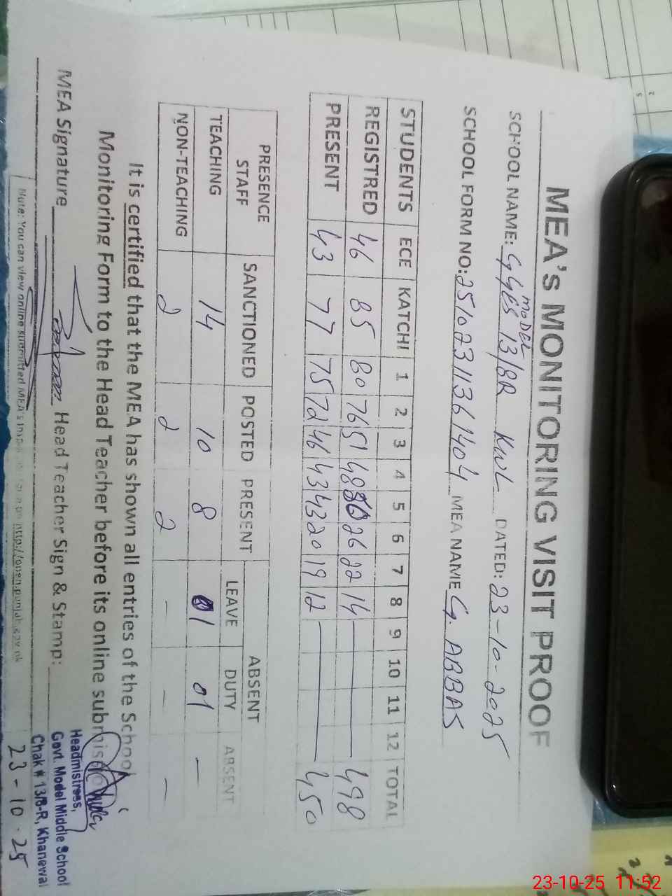 | Attendance Register | Head Teacher | MEA with School | Visit Proof |