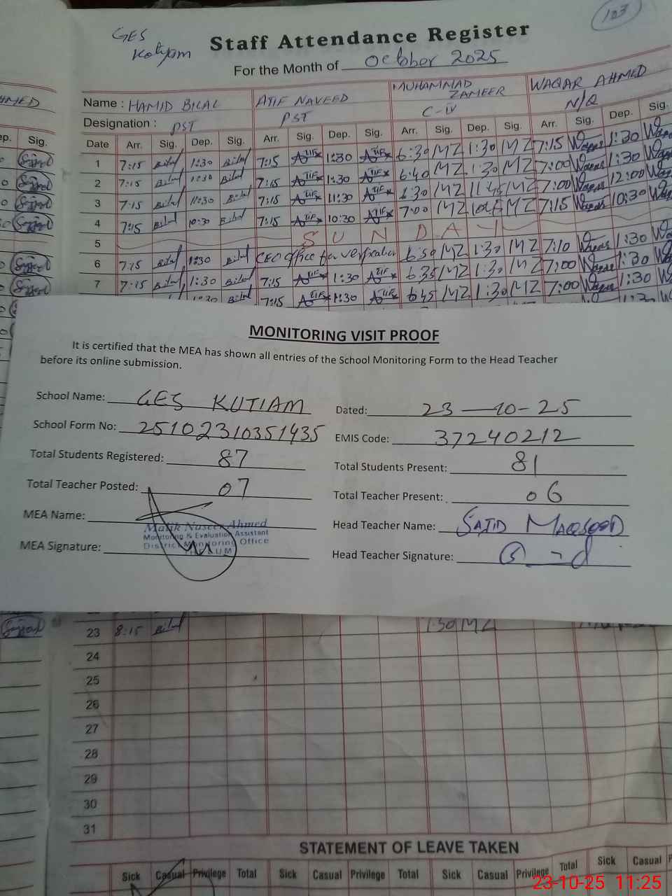 | Attendance Register | Head Teacher | MEA with School | Visit Proof |