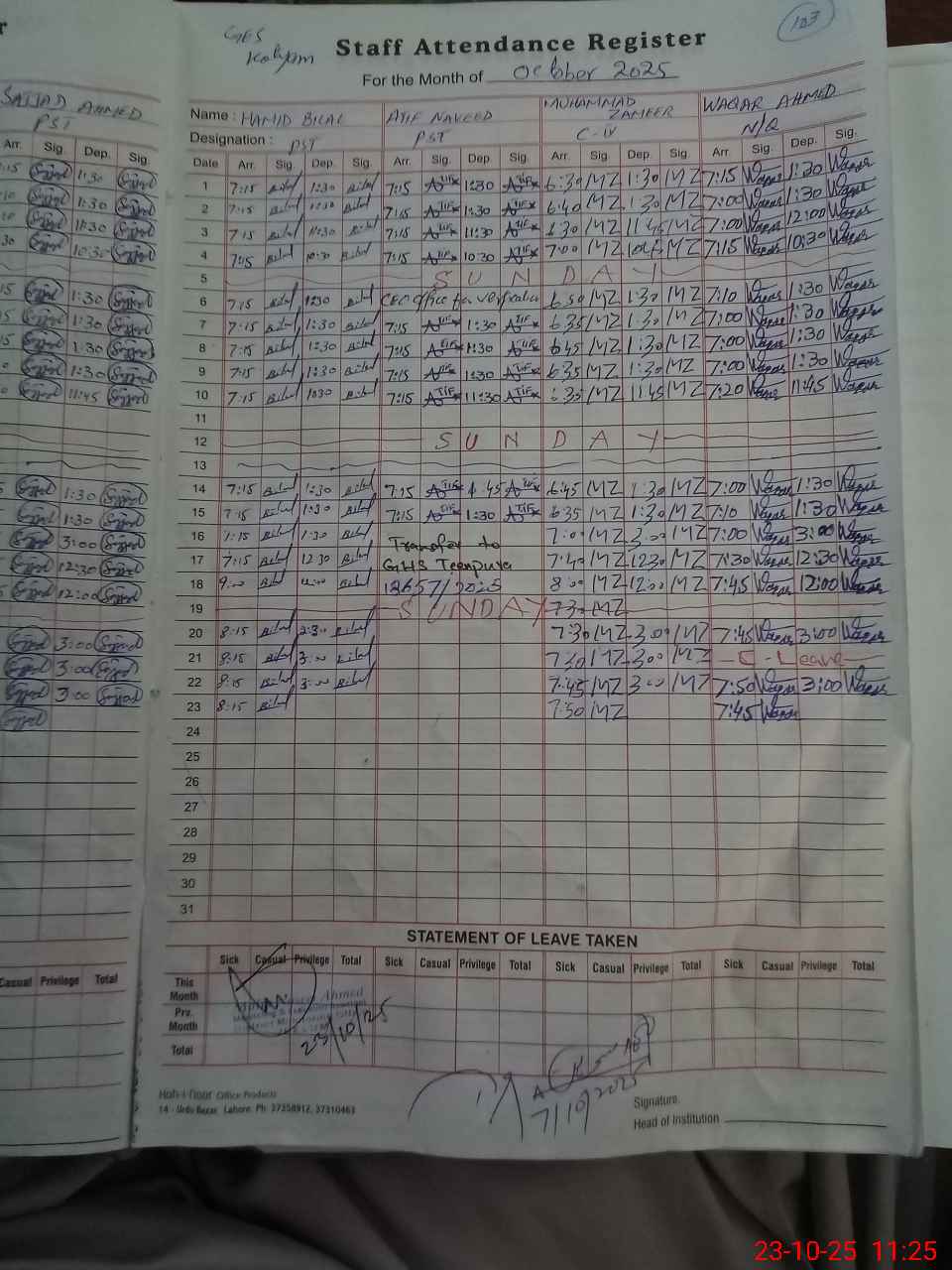 | CNIC | Full Name | Designation | R/C | Absence During Last Calender Month |