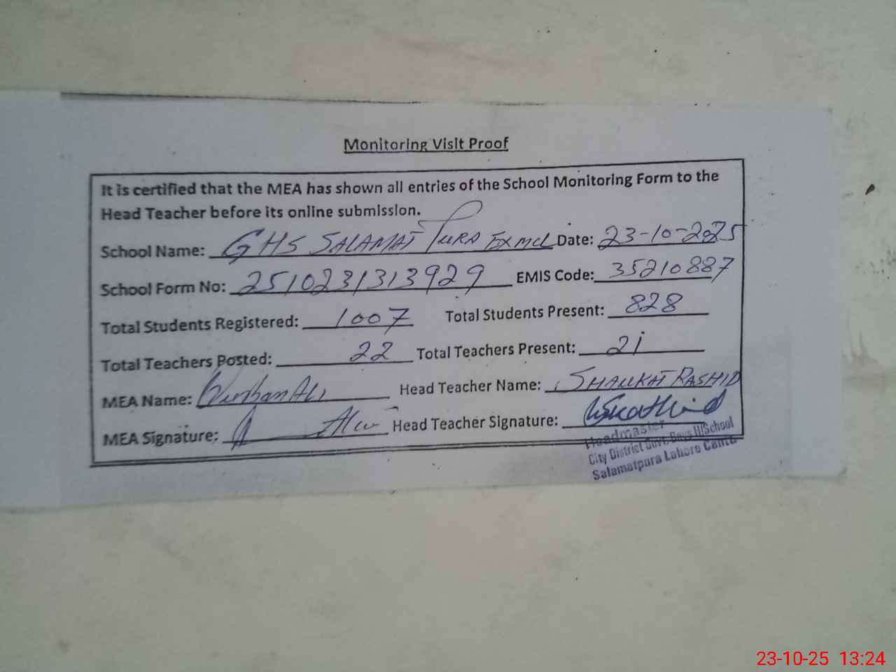 | EMIS Code: 35210887 | Name of School: GHS SALAMAT PURA (EX-MCL) | |||