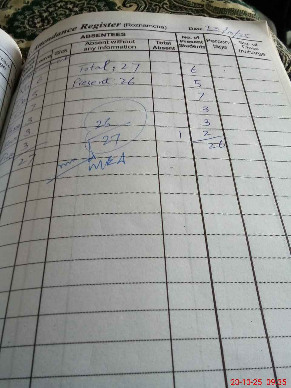 | Total Students Present | 0 | 0 | 6 | 5 | 7 | 3 | 3 | 2 | 26 | |||||||