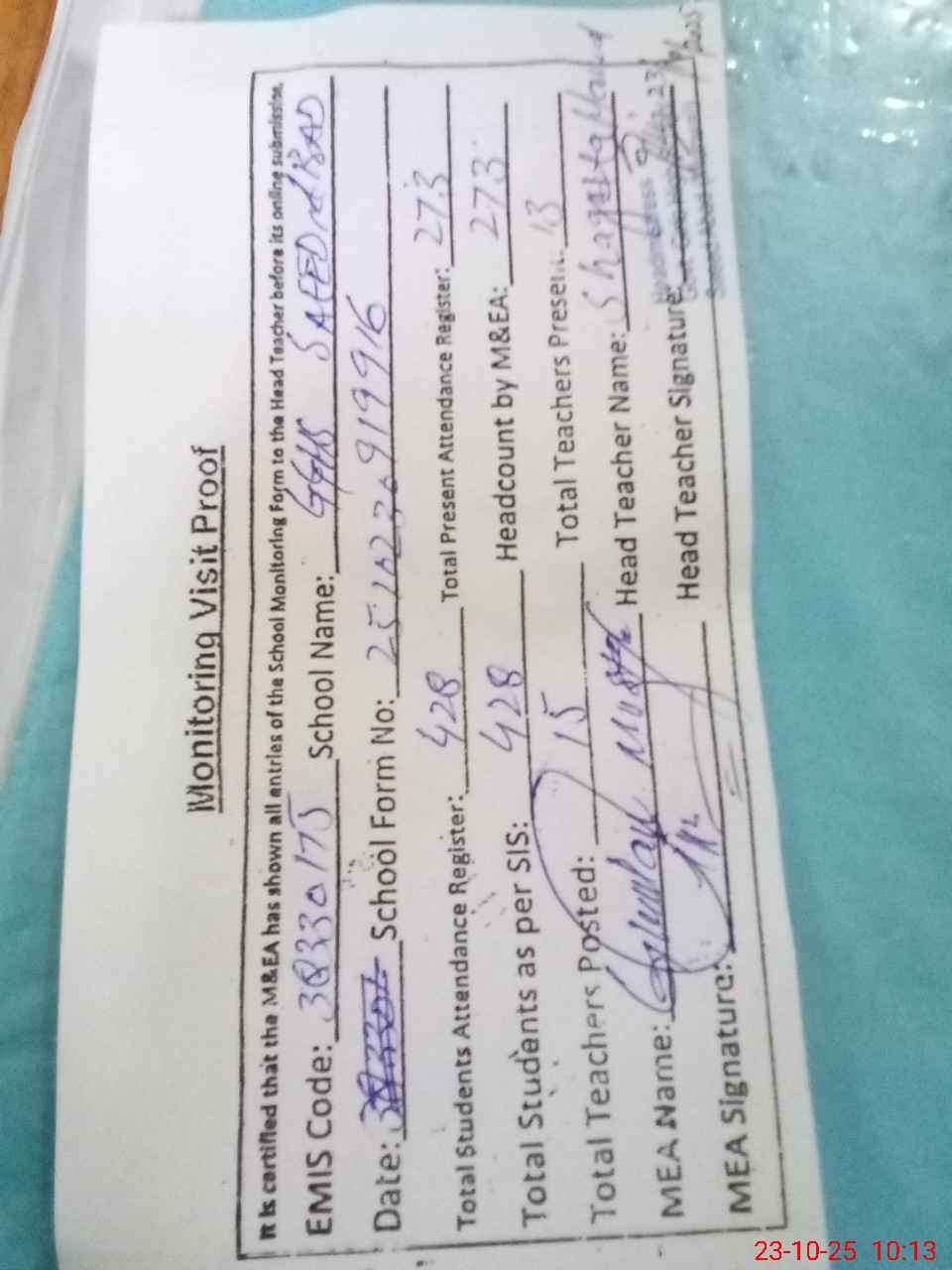 | Attendance Register | Head Teacher | MEA with School | Visit Proof |