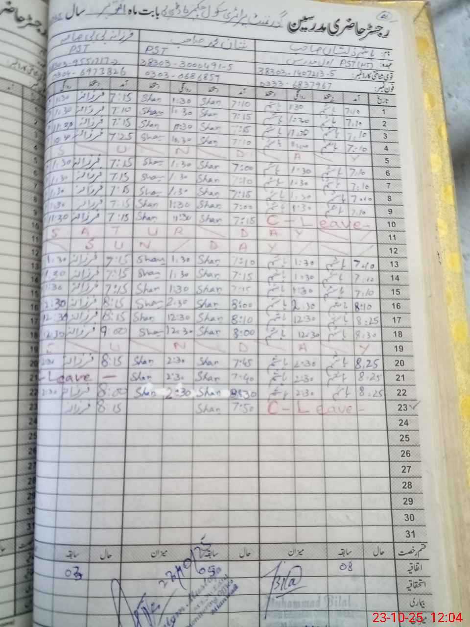 | CNIC | Full Name | Designation | R/C | Absence During Last Calender Month |