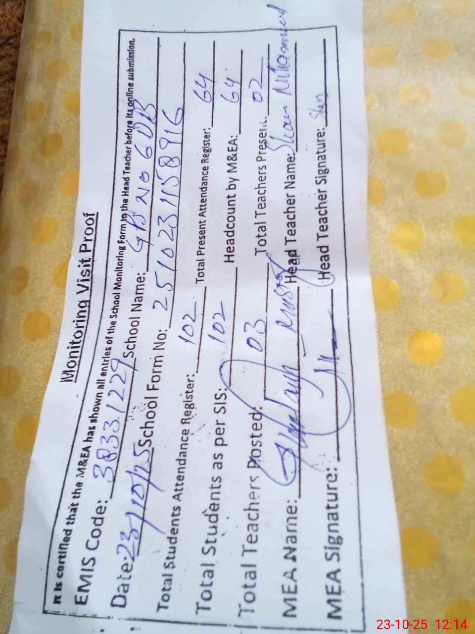 | Attendance Register | Head Teacher | MEA with School | Visit Proof |