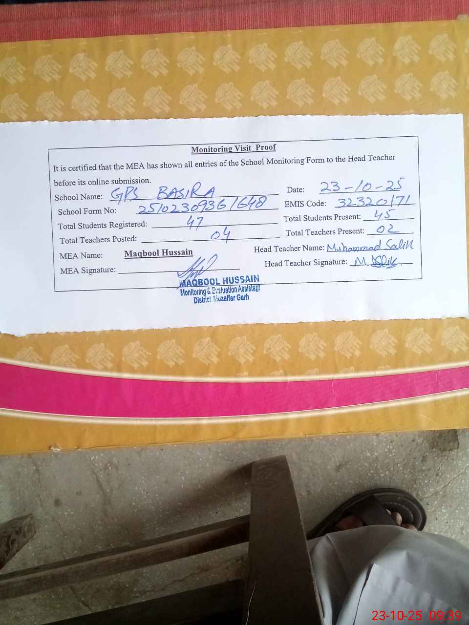 | Attendance Register | Head Teacher | MEA with School | Visit Proof |
