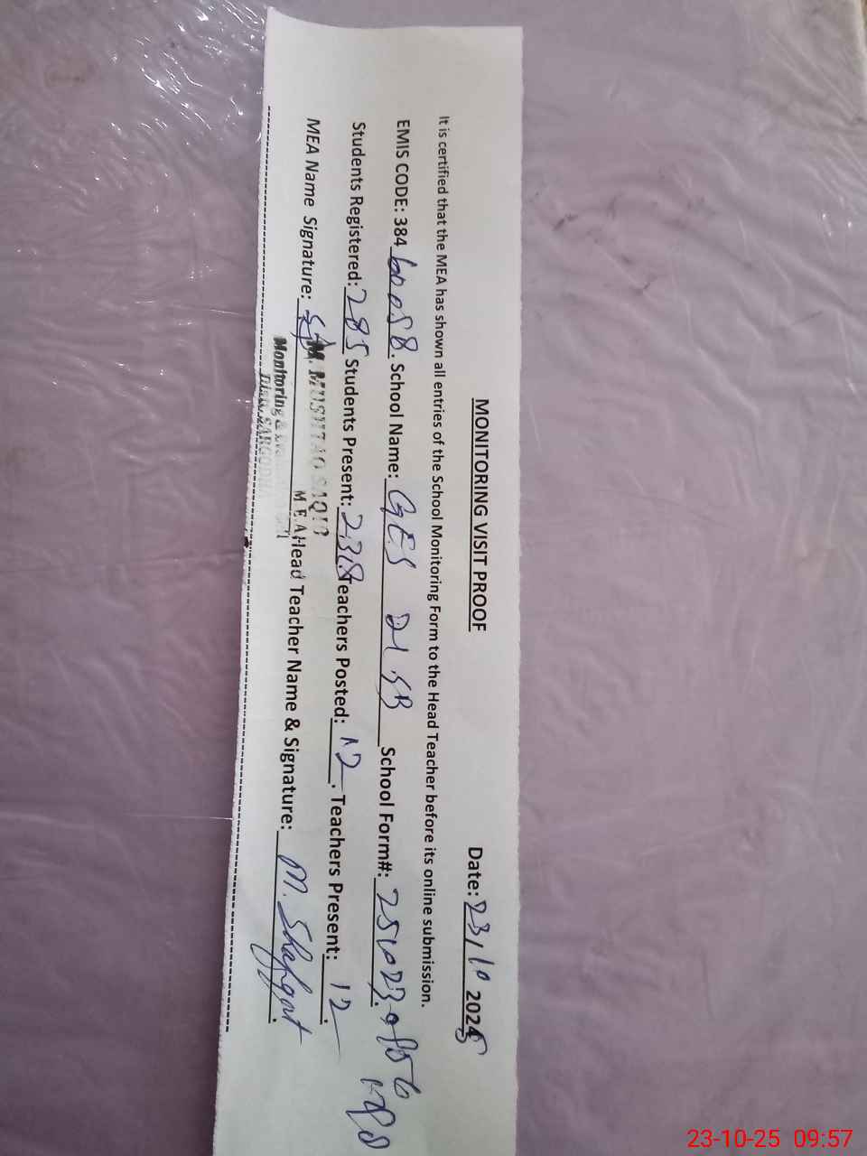 | Attendance Register | Head Teacher | MEA with School | Visit Proof |