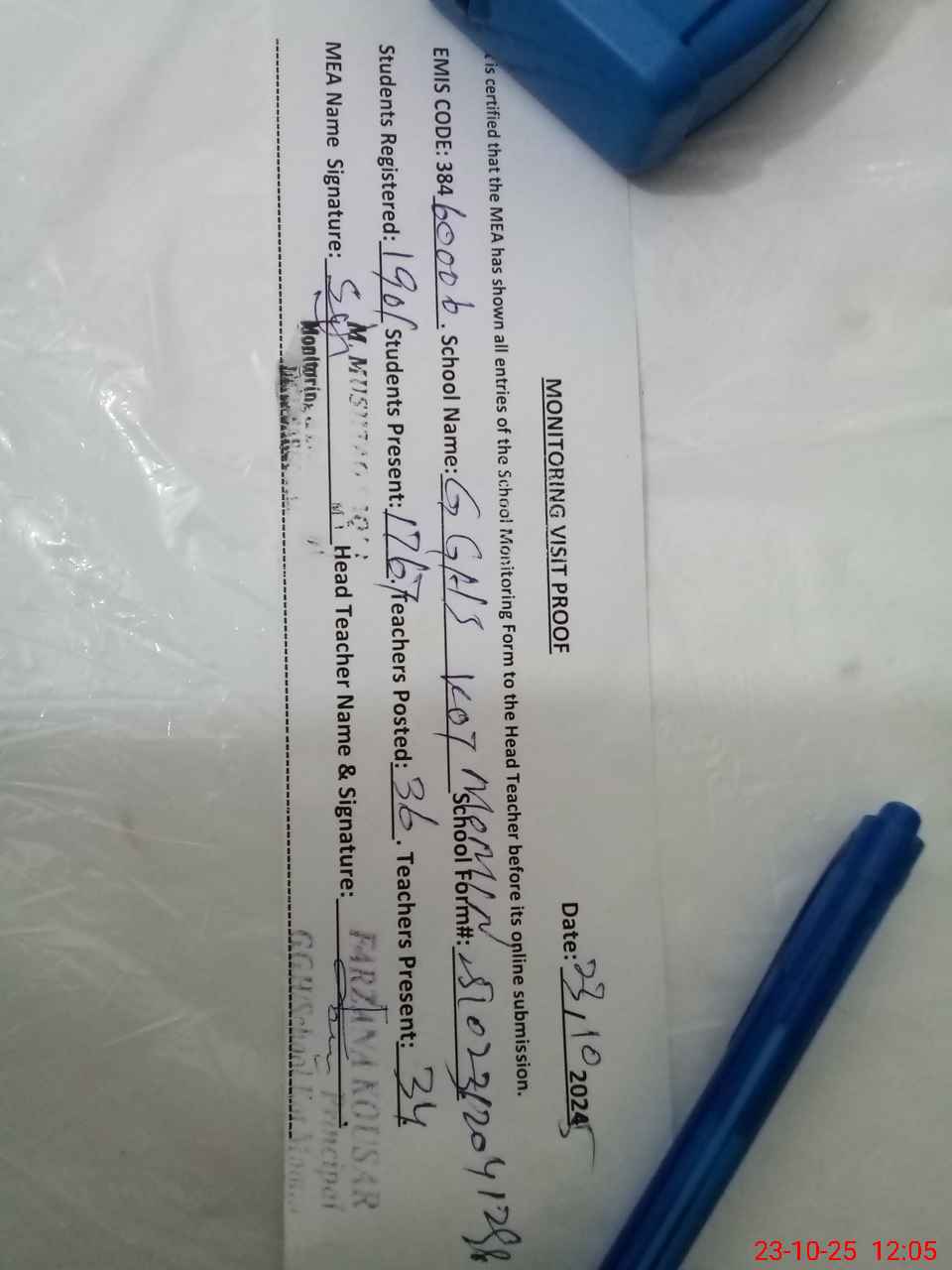 | Attendance Register | Head Teacher | MEA with School | Visit Proof |