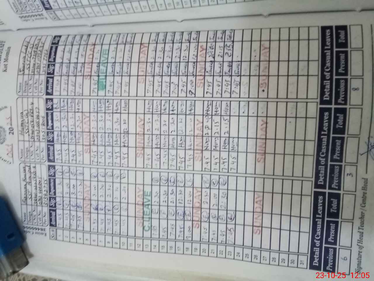 | CNIC | Full Name | Designation | R/C | Absence During Last Calender Month |