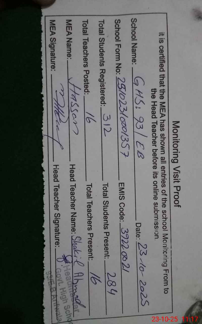 | EMIS Code: 39220021 | Name of School: GHS 93/E-B TEH ARIF WALA | |||