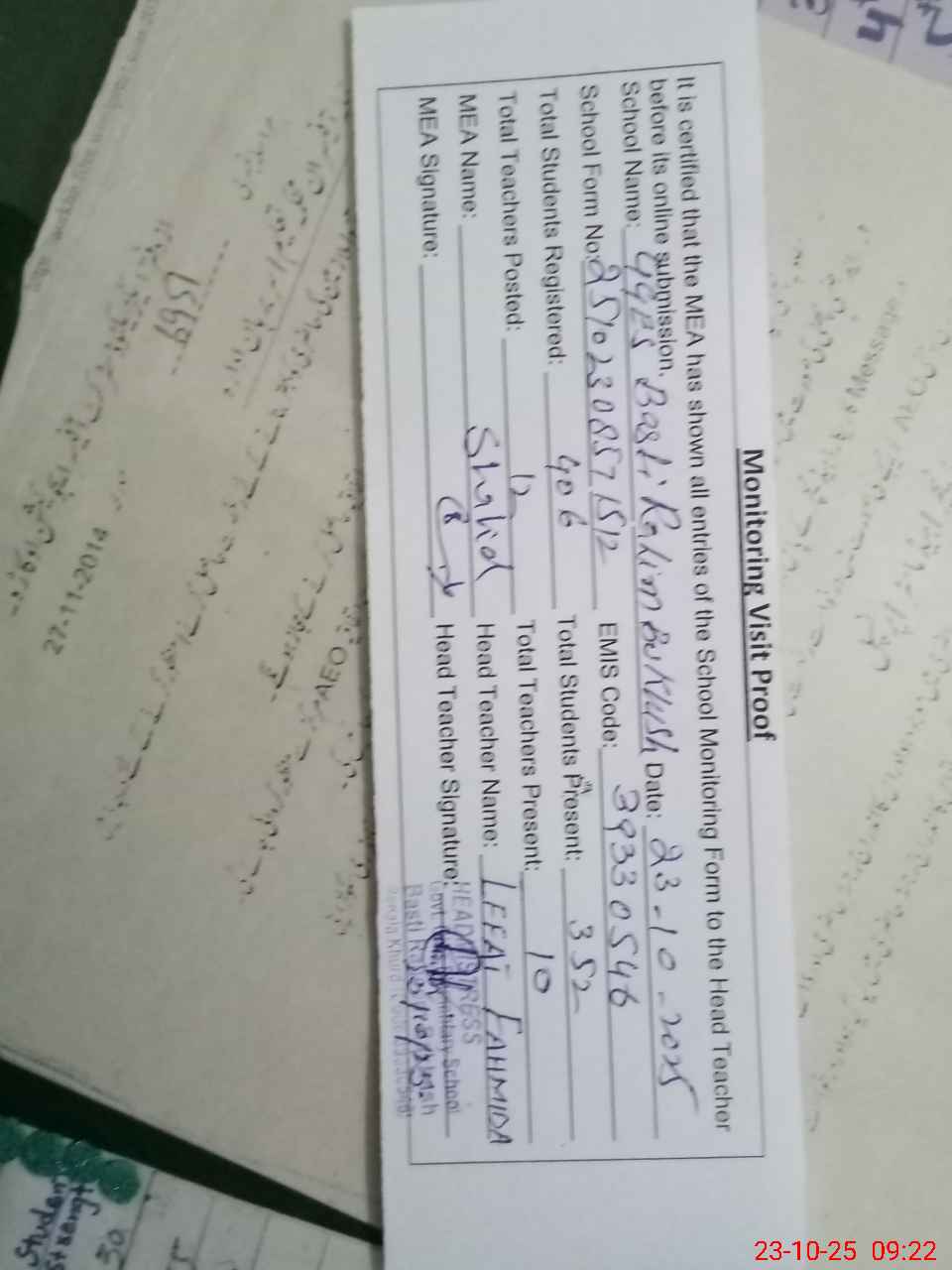| Attendance Register | Head Teacher | MEA with School | Visit Proof |