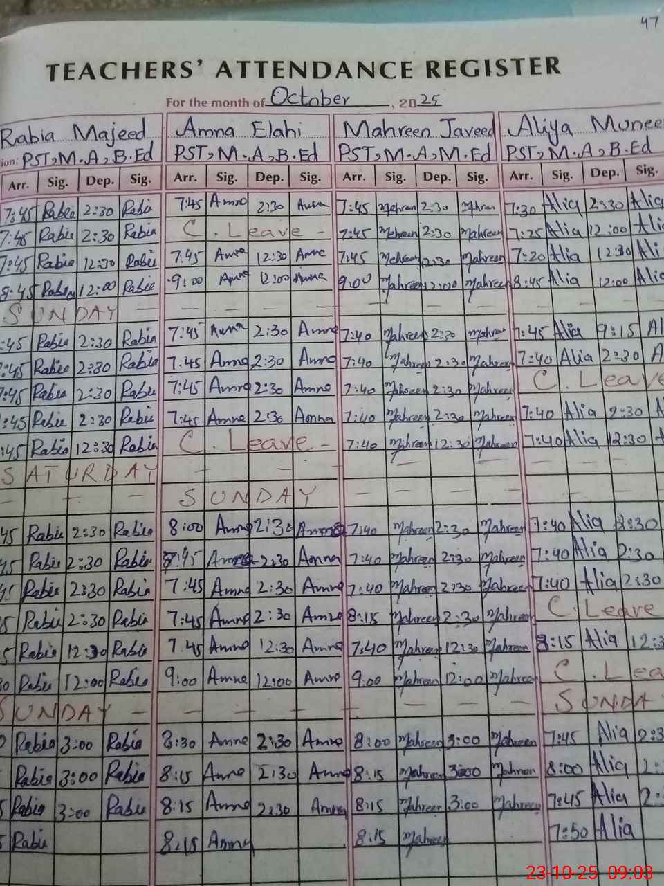 | CNIC | Full Name | Designation | R/C | Absence During Last Calender Month |