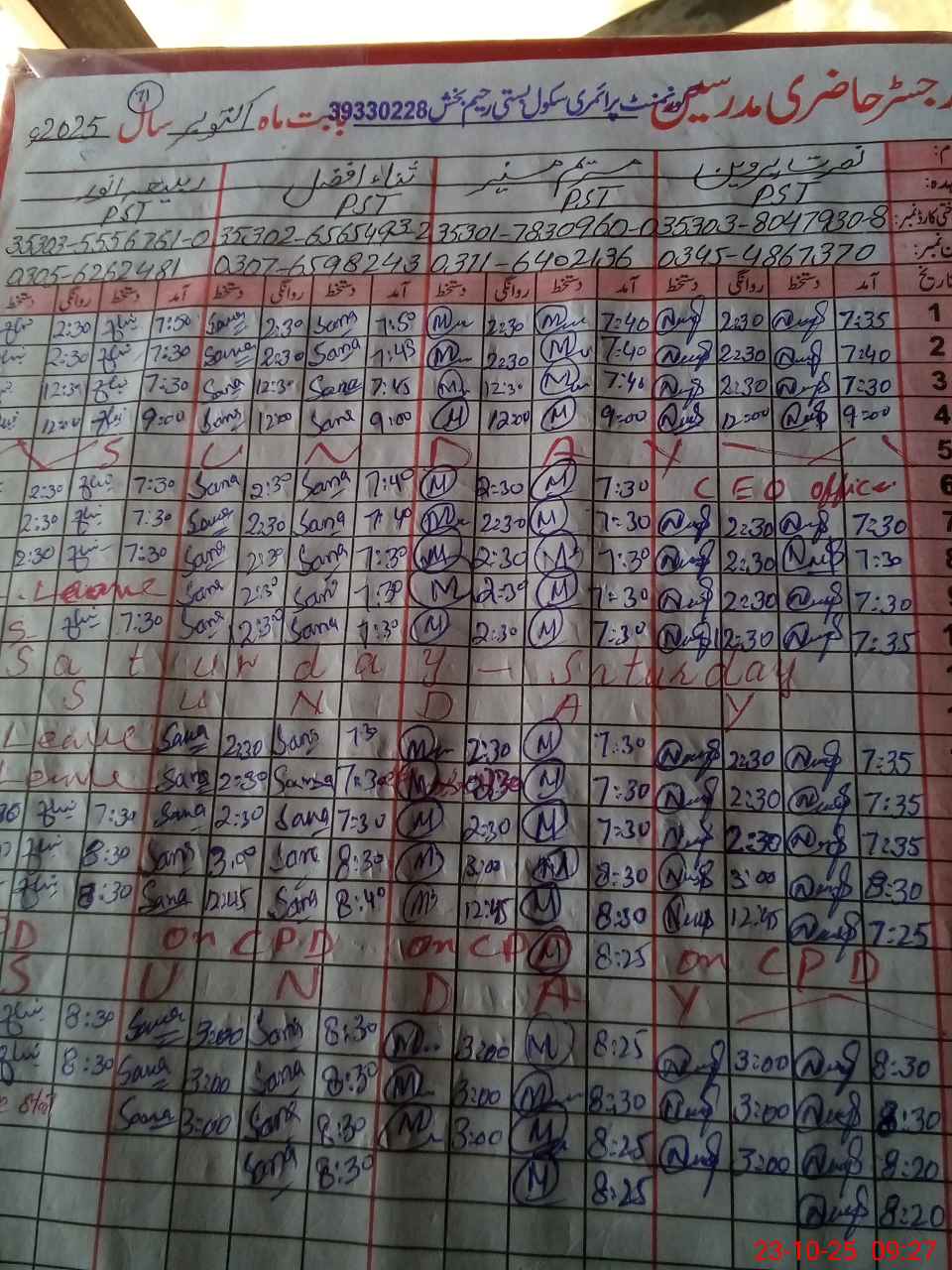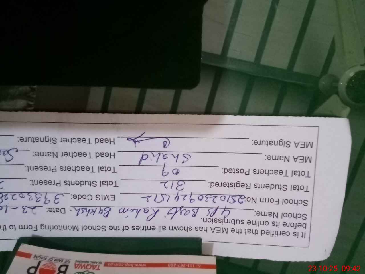 | Name: Za**** UDDi**** Ba**** Designation: (School Headmaster's/Headmistress's) PST Phone/Cell Number: 03**** |