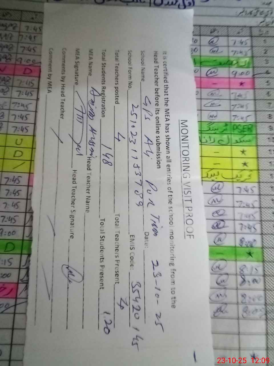 | Attendance Register | Head Teacher | MEA with School | Visit Proof |