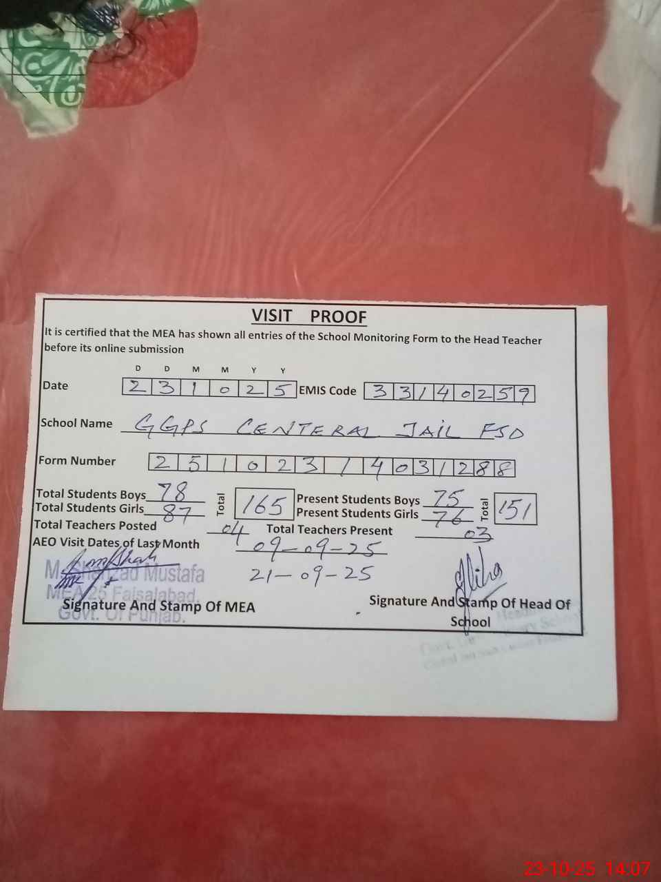 | Attendance Register | Head Teacher | MEA with School | Visit Proof |