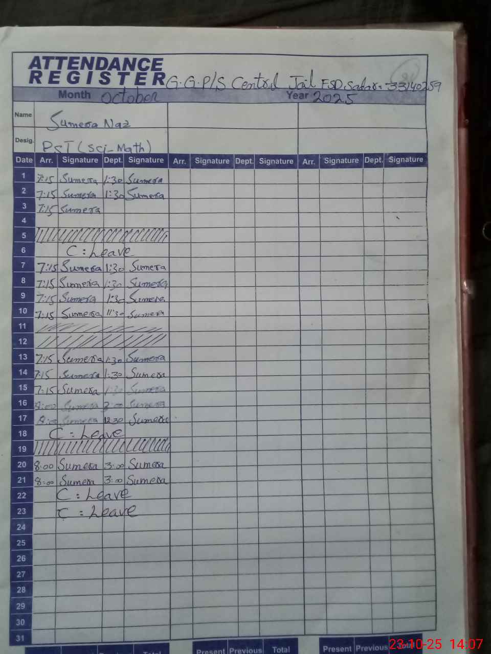 | CNIC | Full Name | Designation | R/C | Absence During Last Calender Month |