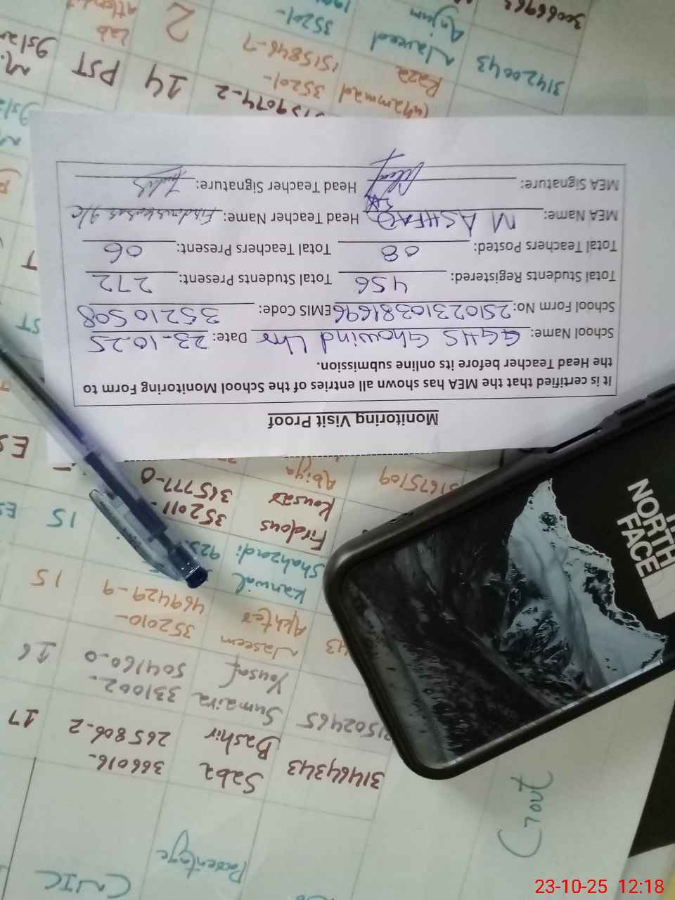 | Remarks (Use Separate Page if Required): Junior Clerk Sidra Ilyas on leave register shown as casual leave but no leave record found so mark him absent today School has total 15 rooms while 01 room looking partially dangerous and also in use EST Abiya Khan long absent since October 2024 Several classes are without teacher School boundary wall status is poor damaged at several points Over all whole the school building condition is satisfactory NSB register not updated School has very large ground but no proper grass plant at here looking so muddy 35210508 | |||||